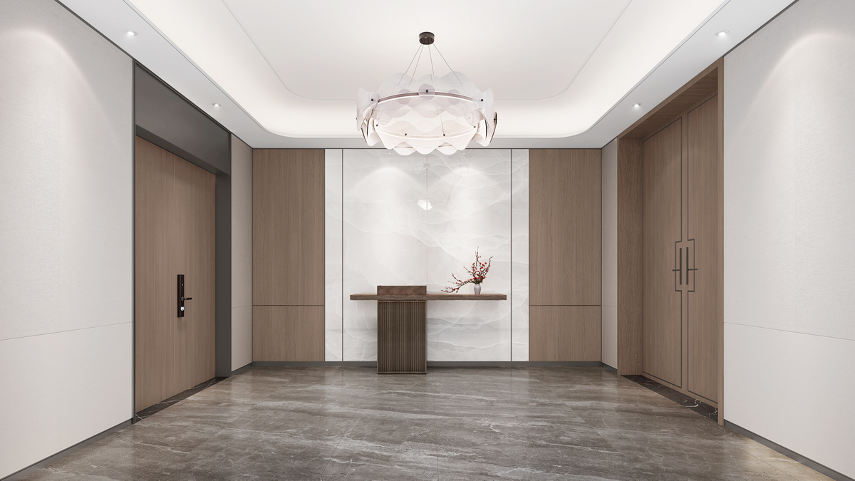 上圖是進(jìn)門小廳設(shè)計(jì),頂面造型石膏板設(shè)計(jì)具有時(shí)尚設(shè)計(jì)感;端景墻面木飾面與山水畫墻布質(zhì)感鮮明。