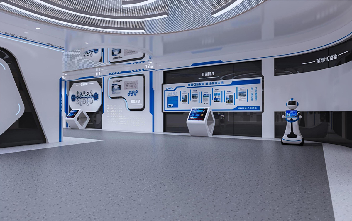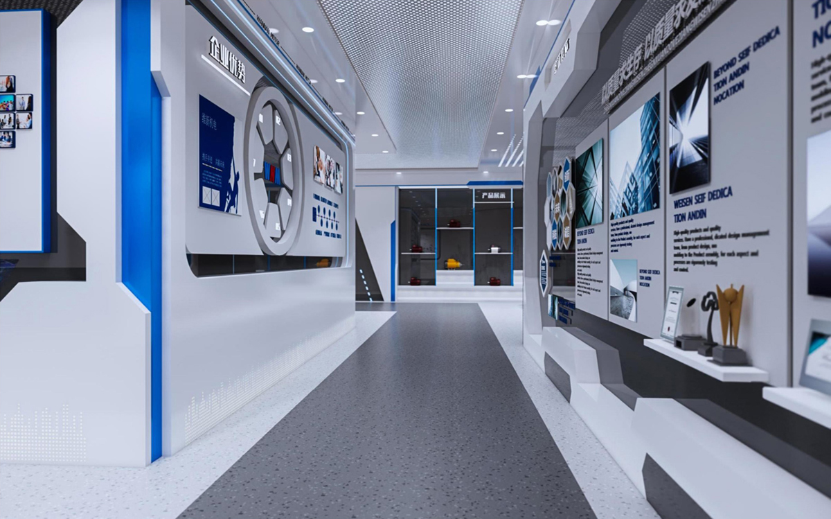 展廳的色彩選用藍(lán)色為主色調(diào),藍(lán)色是一種冷色調(diào),能營(yíng)造出安靜沉穩(wěn)的視覺(jué)感。藍(lán)色也被稱(chēng)為科技藍(lán),是名副其實(shí)的科技色。加上一些中性色搭配,更加讓人感覺(jué)大氣、典雅、莊重。