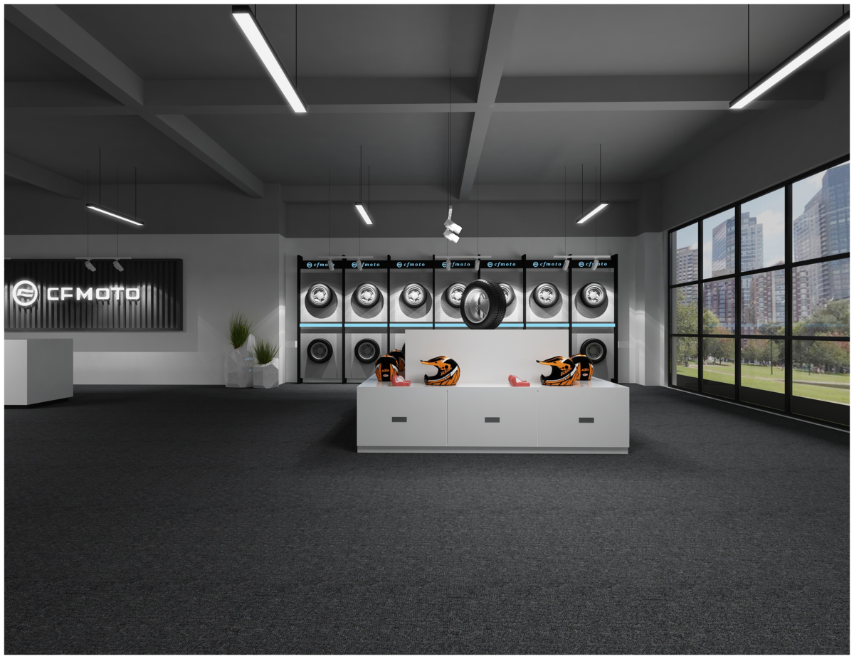 設(shè)計顏色主要以黑灰為主,黑色代表神秘與大氣。摩托車展區(qū)設(shè)計的是立體梯臺,頂面都用灰色乳膠漆粉刷,地面先是找平后鋪設(shè)深灰地毯。吧臺采用乳白色的木質(zhì)吧臺配上黑色鋁方通的logo墻。吧臺背景墻與吧臺的logo板想呼應(yīng),都是黑色鋁方通配上企業(yè)LOGO,正前方使用吊頂射燈凸顯背景墻。
