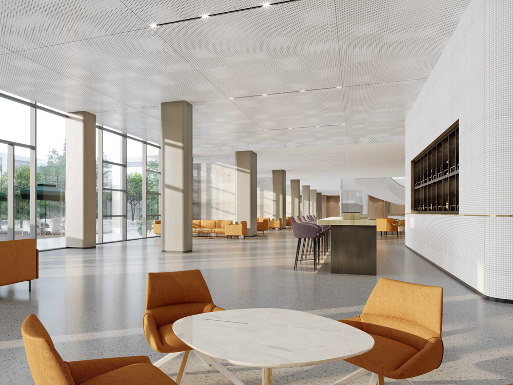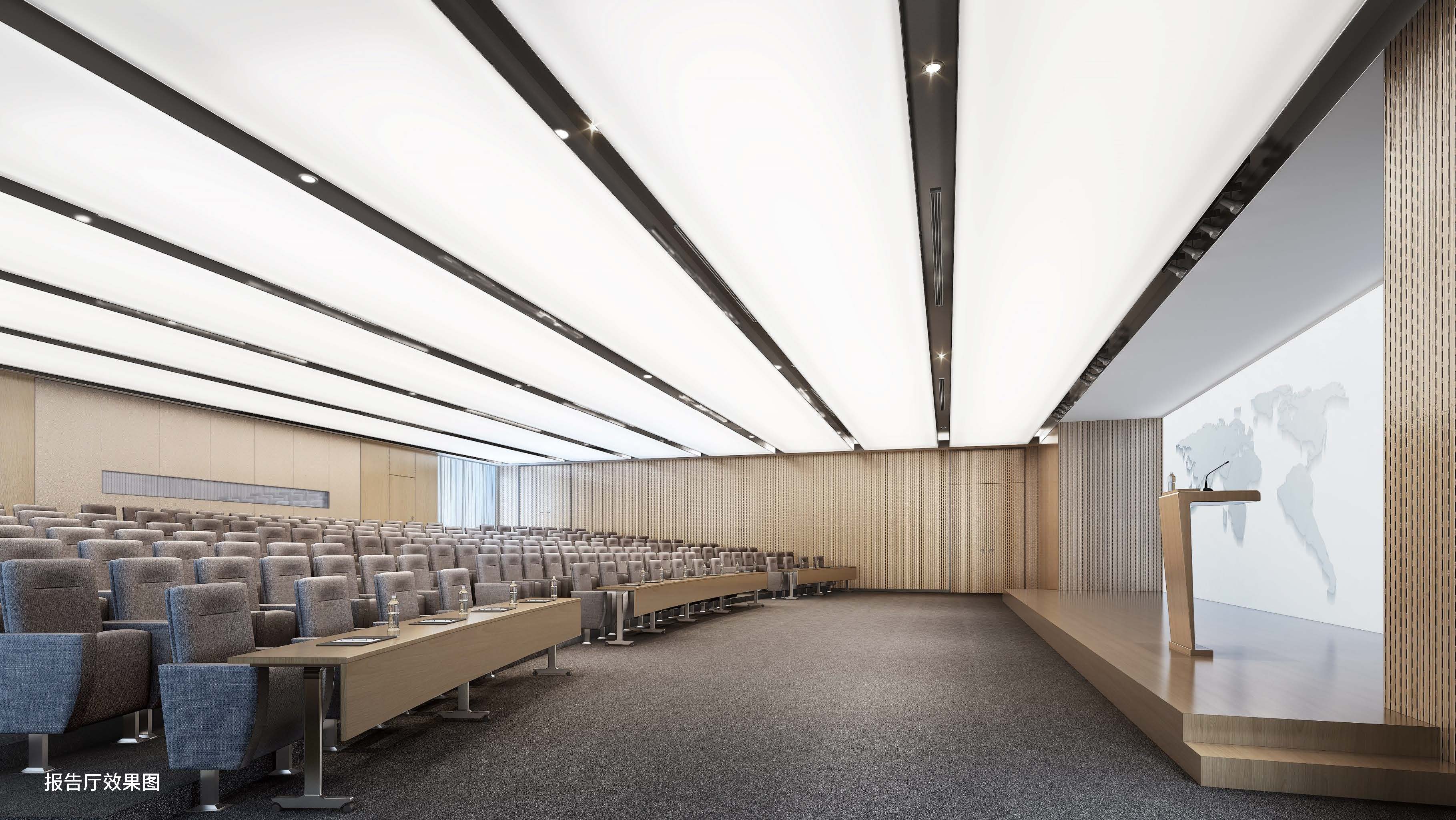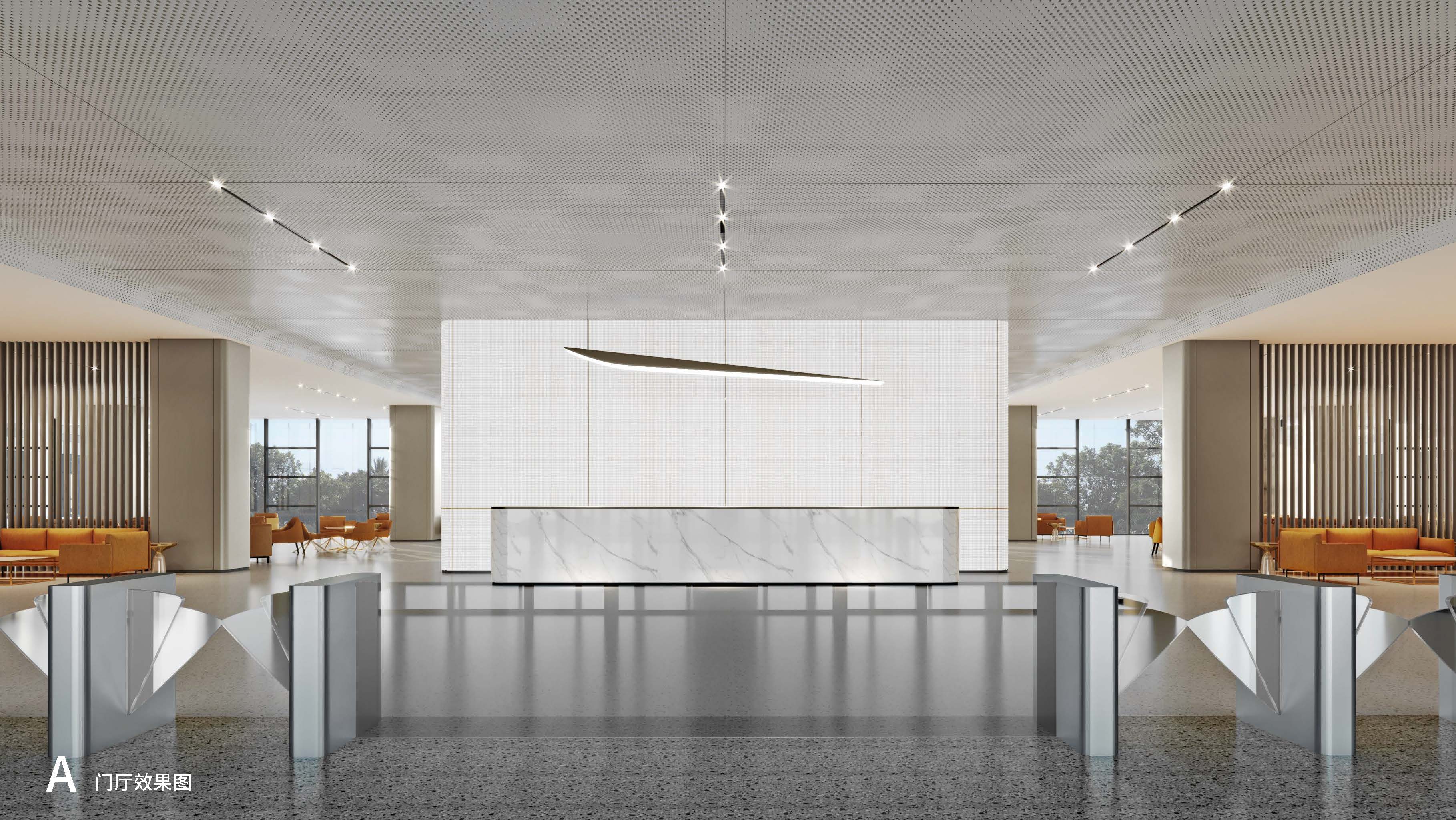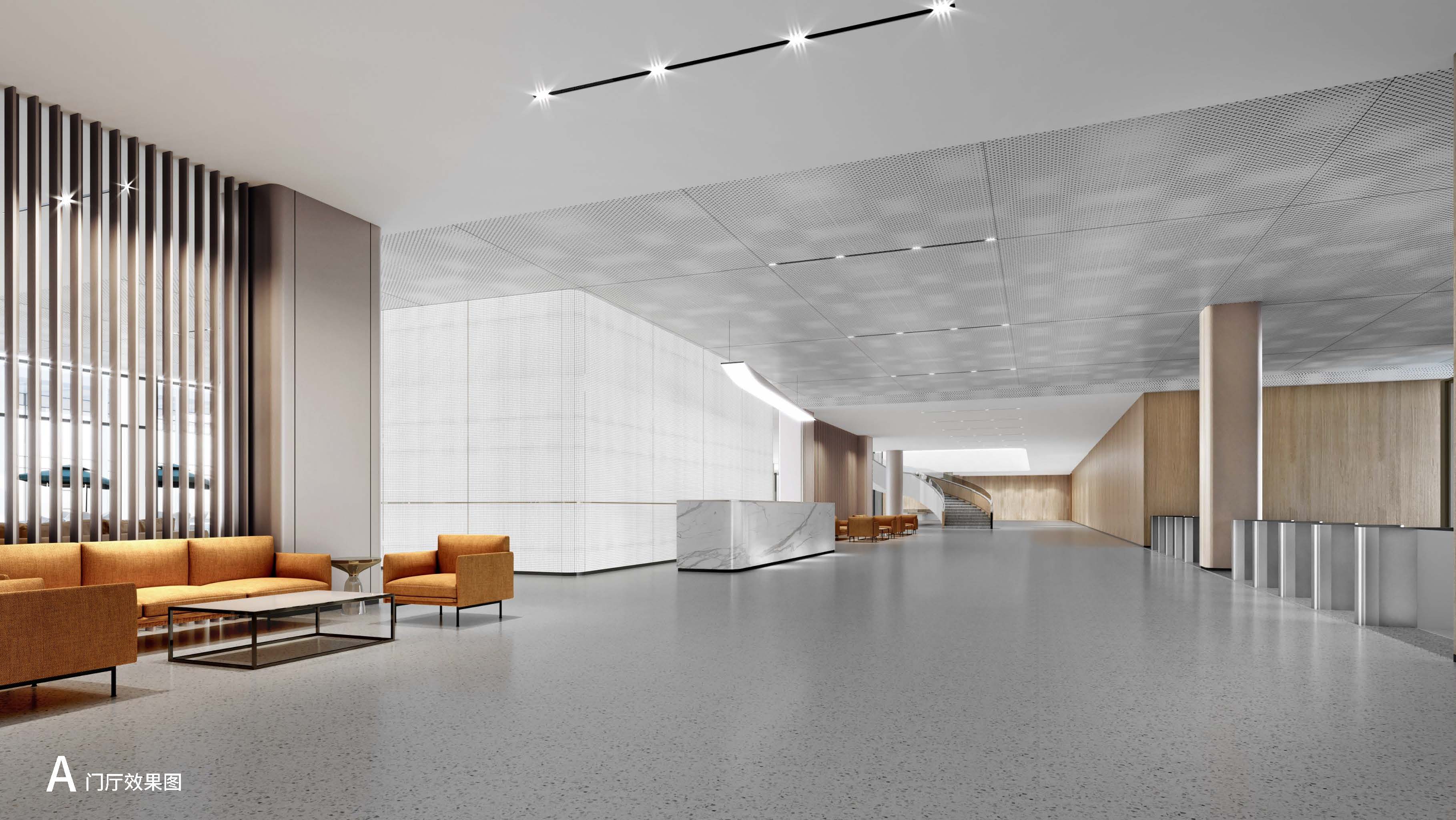 大廳空間大面積運用了中性色,少量橙色的跳躍,使得整個空間不會過于沉悶,讓人在心理上產(chǎn)生溫馨、和諧、溫暖的感覺。