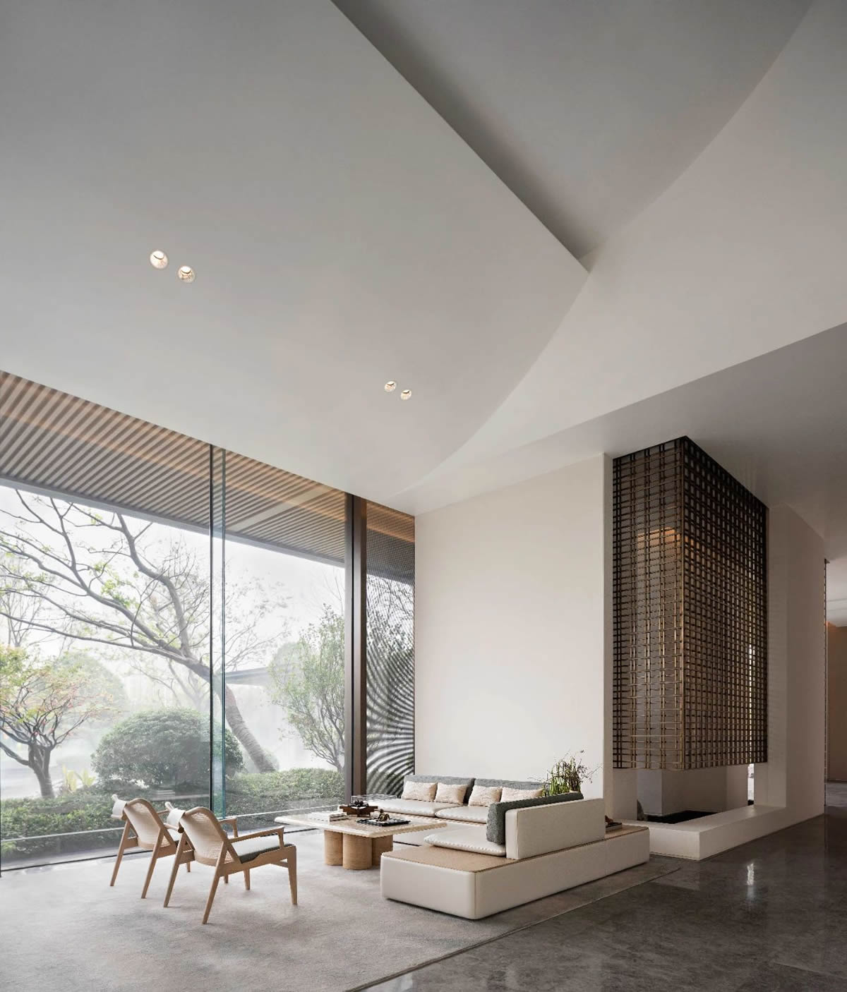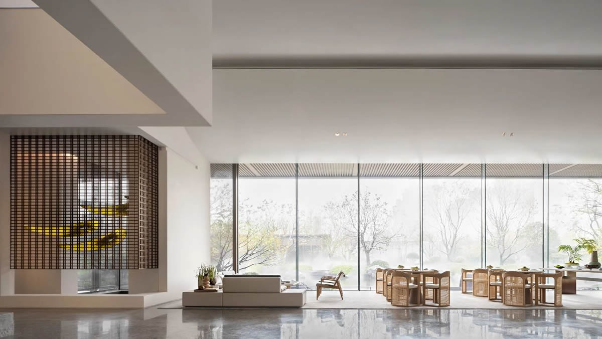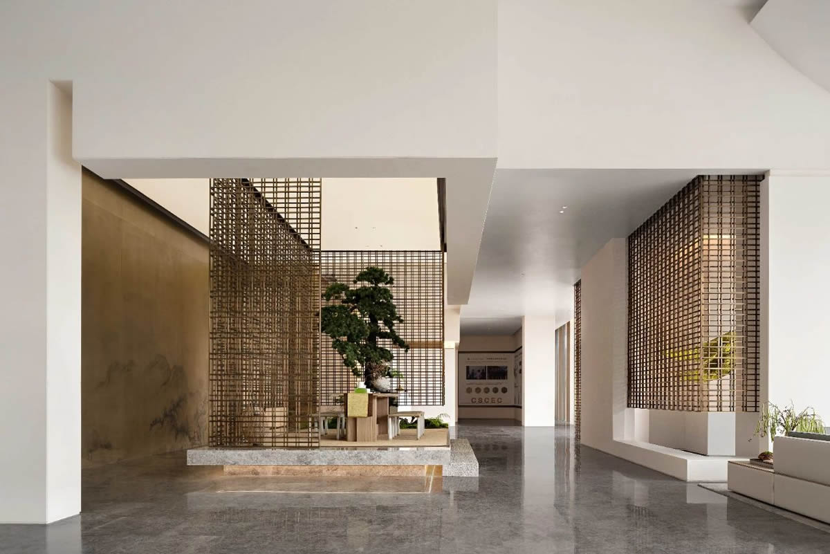 茅萊仙境,樹林參天,透過柵格墻,后方的樹木若隱若現(xiàn),仿佛時(shí)間靜止一般。靜謐的意境,從天井灑下的陽光,營(yíng)造出仙境般的景色。