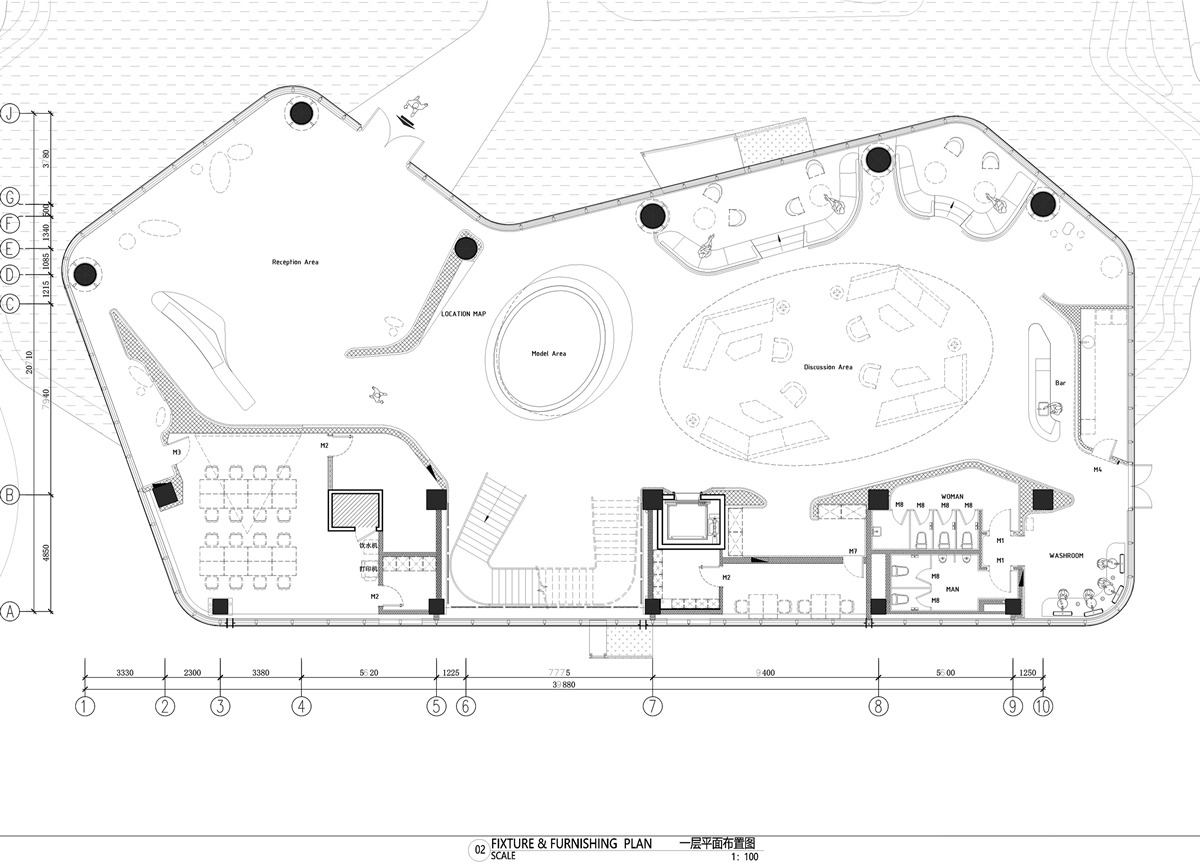 如何將該區(qū)域的主角——沙盤,整個區(qū)域除了從入門處的穿堂光線,猶如山巒層層疊疊的水晶沙盤吊燈也對室內(nèi)光線進(jìn)行了補(bǔ)充。光線通過玻璃幕墻,與沙盤大燈在鏡面內(nèi)與鏡面外形成呼應(yīng),空間從視覺上得以擴(kuò)大。