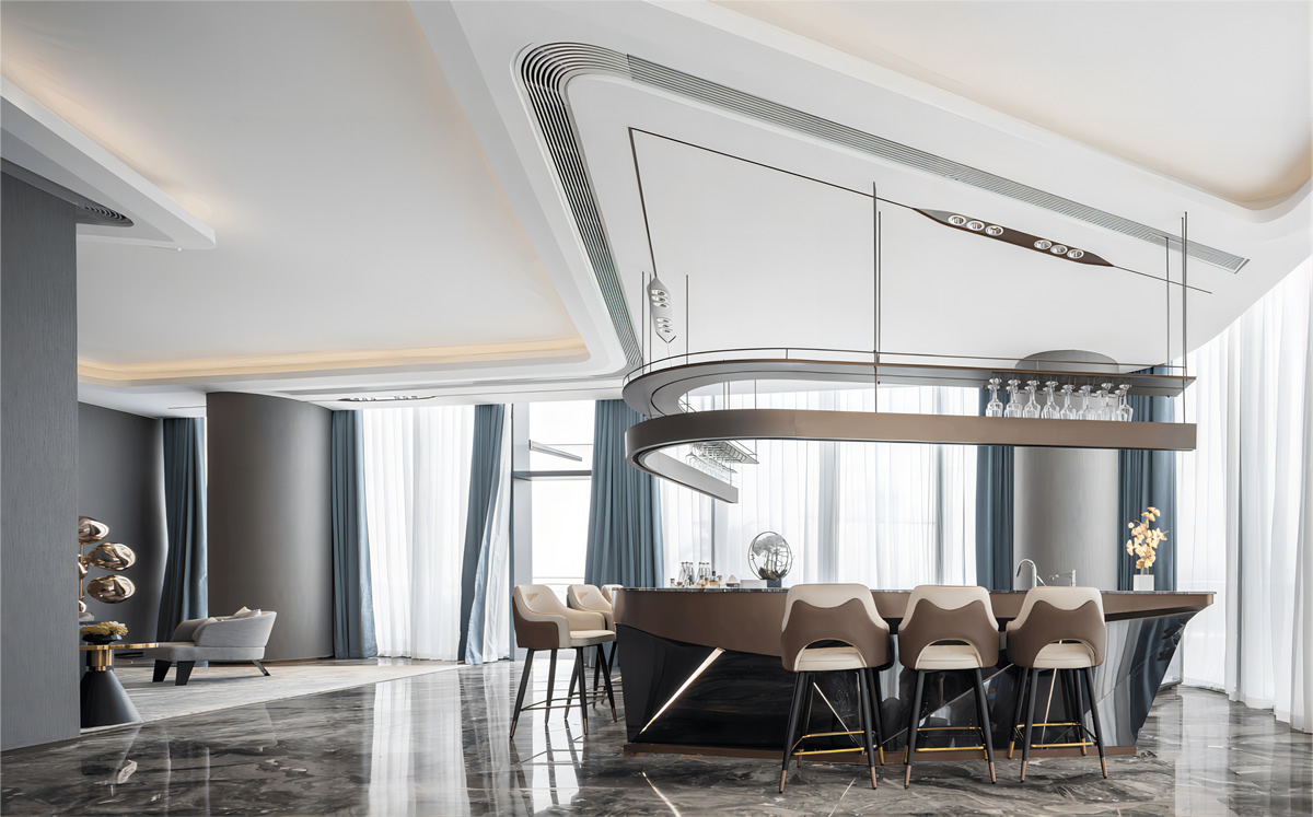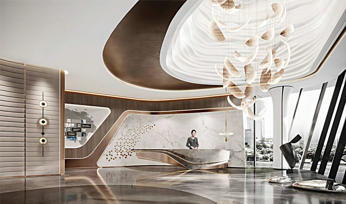 本案采用石材、木紋做主材,在燈具上融入水晶元素提升空間質(zhì)感,將傳統(tǒng)的元素運用現(xiàn)代的手法進(jìn)行演繹,以現(xiàn)代產(chǎn)物金屬的飾品來提升空間。整個營銷中心將現(xiàn)代科技完美地融合進(jìn)現(xiàn)代生活,造就空間的內(nèi)涵、端正與曲線。