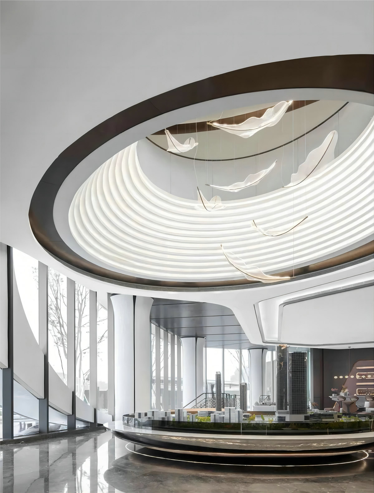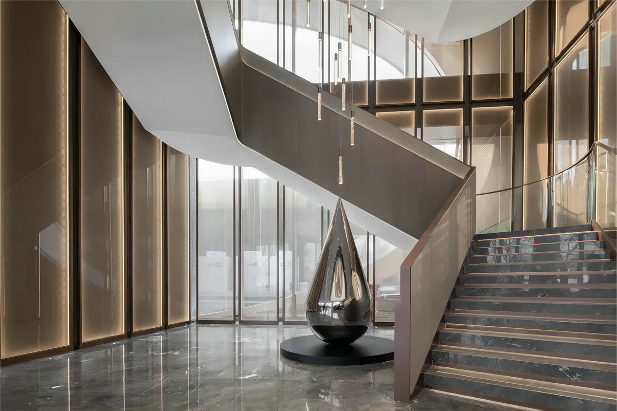 與沙盤遙相呼應(yīng)的是一座巨大的景觀樓梯,透明玻璃幕墻和深色石材形成對比。