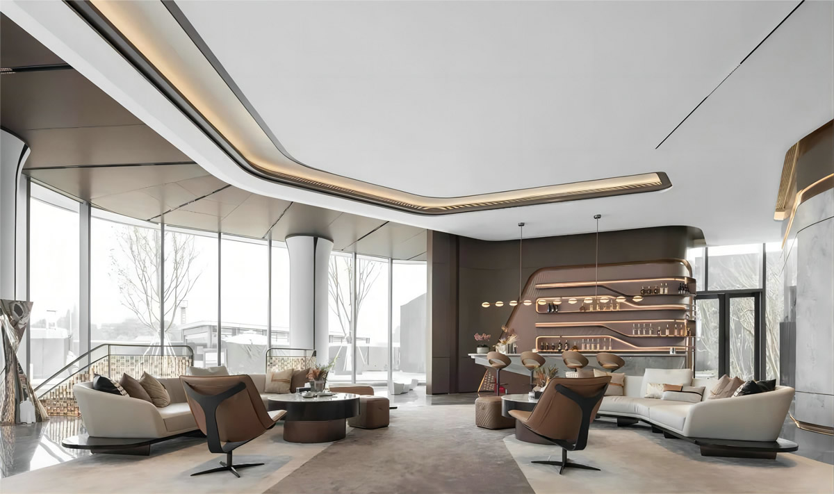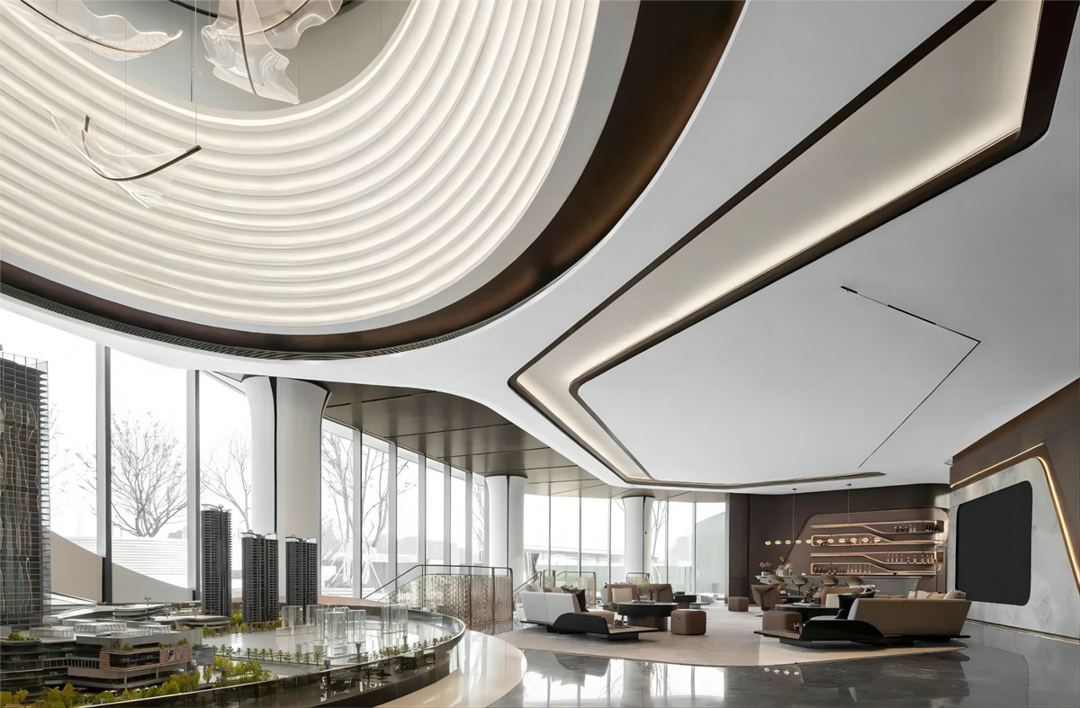 售樓部是項目形象代言人,不僅能展示項目的專業(yè)水準(zhǔn)與品牌形象,更能刺激消費者購買欲,并其重要程度不言而喻。是一個小型建筑體的綜合設(shè)計,它的規(guī)模不大,但承載著樓盤形象、客戶體驗、銷售完成等功能,因此是個外在炫目,內(nèi)在功能高度集中的場所。