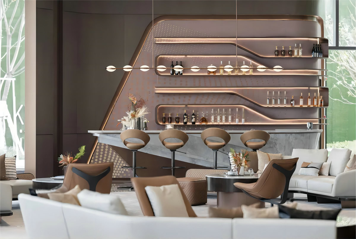 洽談區(qū)對面的水吧區(qū)就以咖啡為主題。整體色調(diào)為咖色。整潔干凈的吧臺環(huán)境,大理石、不銹鋼材質(zhì)的使用打造出現(xiàn)代感。