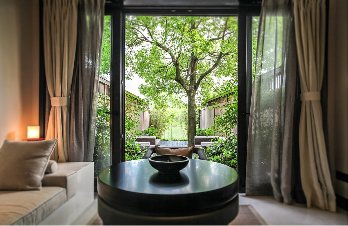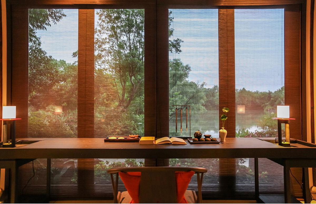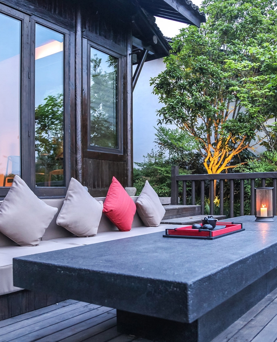 窗,成為重要的媒介。傳統(tǒng)中式的建筑,注重隱、閉,慣以鏤空的窗格采光。在張煒倫的設(shè)計(jì)視角中,當(dāng)代的中式建筑,不應(yīng)因循守舊,應(yīng)當(dāng)傳遞當(dāng)代的居住精神,讓天光水色,滿盈室內(nèi),無(wú)處不在。她在設(shè)計(jì)中,以大面積開(kāi)窗面打破了建筑的閉合感??蚣芙Y(jié)構(gòu)與明朗玻璃窗,將室外的水云天,與室內(nèi)閑逸之心,融為一體。戶外露臺(tái)、湯池的無(wú)邊界設(shè)計(jì),讓歇息的居者與西溪靜逸水域更為相融。室內(nèi)空間的序列,不設(shè)實(shí)體隔斷,僅透過(guò)裝飾自然過(guò)渡。將床榻、臥具、浴池均面向風(fēng)景,帶來(lái)深度的沉浸體驗(yàn)。晨起、閑坐、品茗、沐浴…每一個(gè)瞬間,都在風(fēng)景簇?fù)砼c環(huán)抱大景小景之間。沿用中式民居的白墻灰石,仿若水墨留白。莊子曰:虛室生白,吉祥止止。這樣純凈無(wú)求的狀態(tài),恰恰是度假心態(tài)的寫(xiě)照。設(shè)計(jì)以虛白與素樸的材質(zhì)色彩,留下足以回味的余韻。