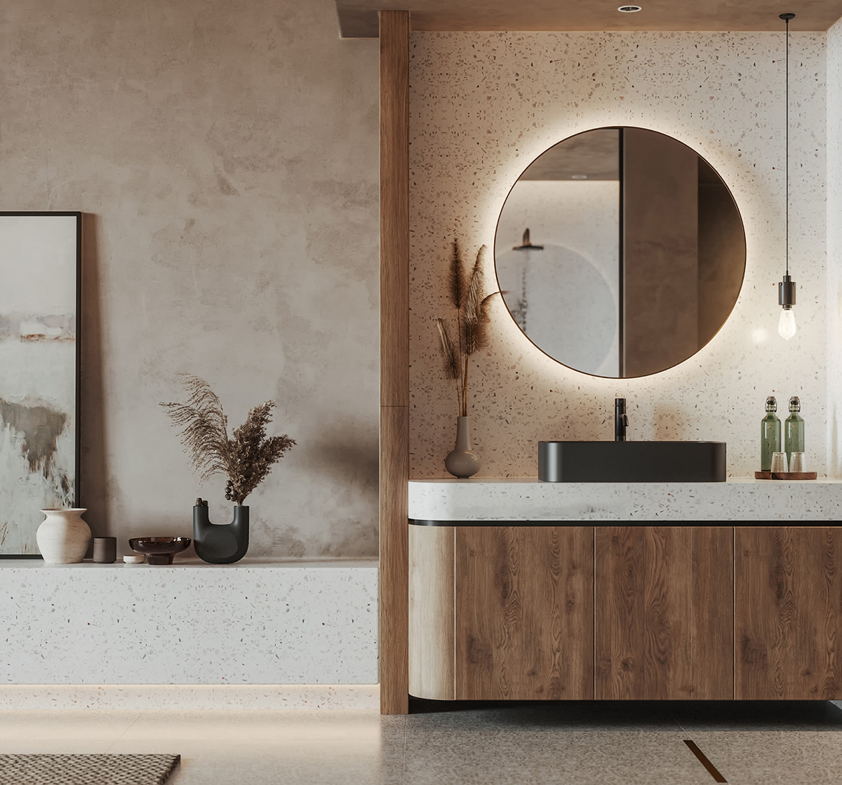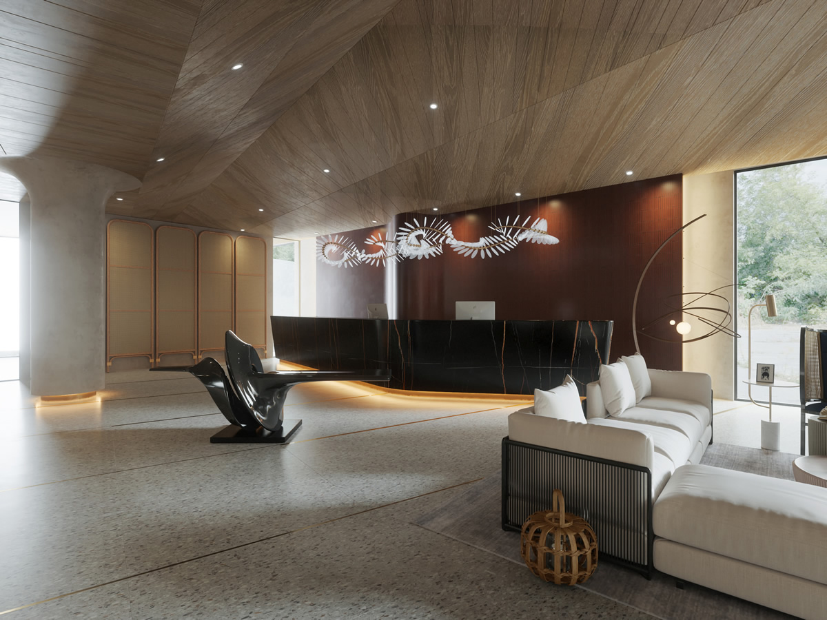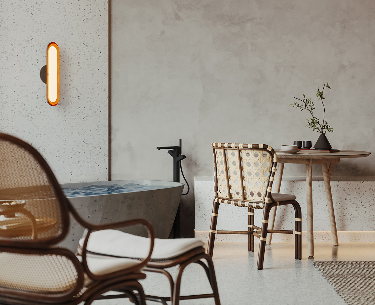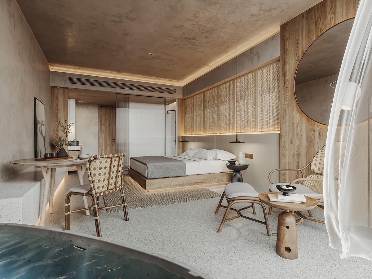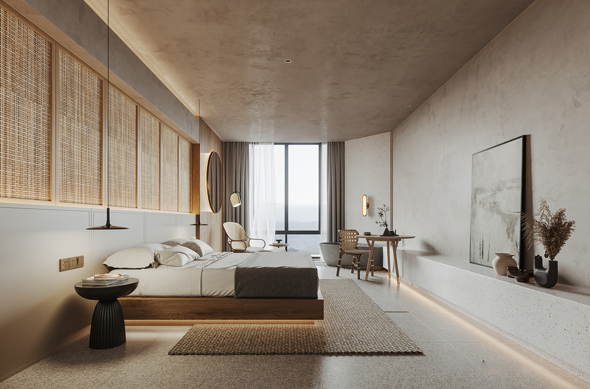 民宿呈現(xiàn)自然松弛的慢生活調(diào)性,讓入住的客人暫時(shí)擺脫日常工作的疲憊和單調(diào),在這里感受久違的質(zhì)樸自然的田園生活,所以在材質(zhì)的選擇上多以親自然、可持續(xù)性為主,比如水泥漆、老木料、天然藤編、麻布等等,作為室內(nèi)墻面、梁架、頂棚的材料。