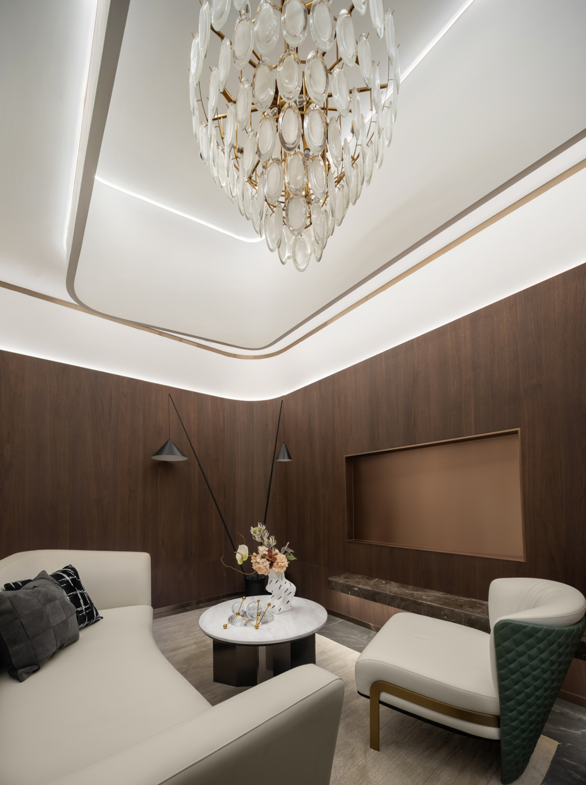 洽談室天花板線型燈設(shè)計(jì),以視覺(jué)界定空間焦點(diǎn),直線無(wú)形延伸了空間寬度,也延伸出空間的優(yōu)越。洽談椅有巧妙的圓弧扶手,恰與墻面抽象畫(huà)成圓弧協(xié)調(diào)姿態(tài),象征微笑擁抱以及佛家笑對(duì)人生,知足常樂(lè)的人生態(tài)度。