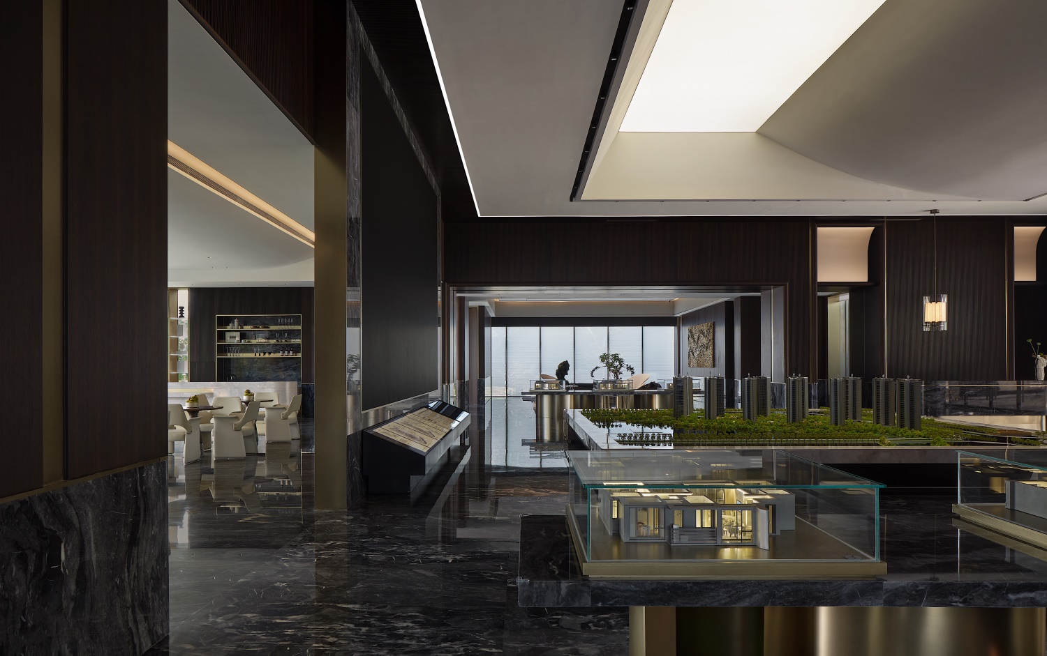 沙盤是最適合設(shè)計師發(fā)揮想象力的地方。四四方方的沙盤,弧形造型吊頂,印證著“天圓地方”的說法,讓沙盤當(dāng)之無愧的成為視覺焦點。