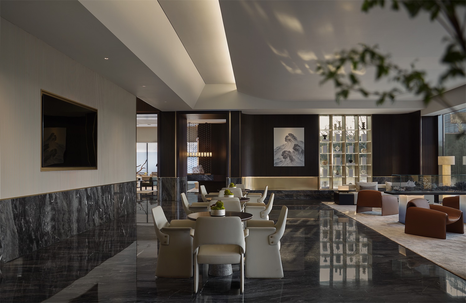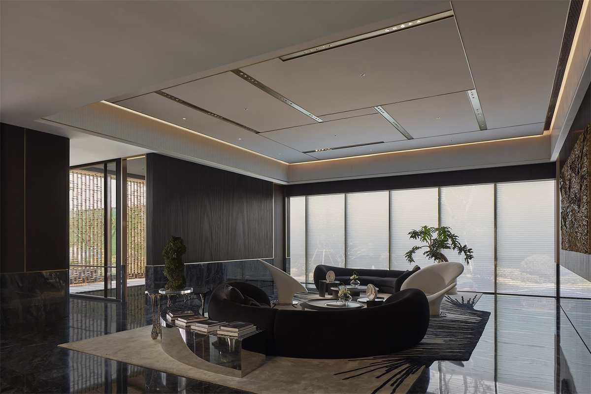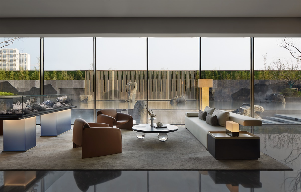 洽談休閑區(qū)落地大玻璃的應(yīng)用,這樣的空間鏈接才能讓顧客感到樓盤的智能化。同時玻璃外的景物及波光粼粼的水面,更能使空間加入一些動態(tài)的元素,以起到動態(tài)與靜態(tài)的交融,整體氣氛給交流溝通提供良好的環(huán)境。