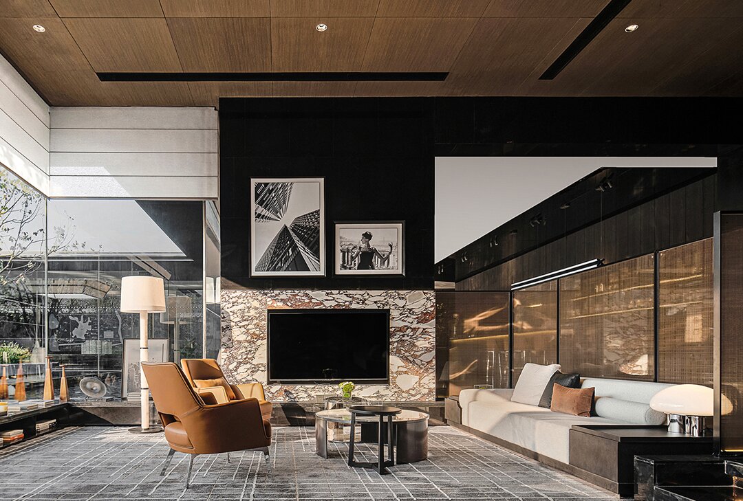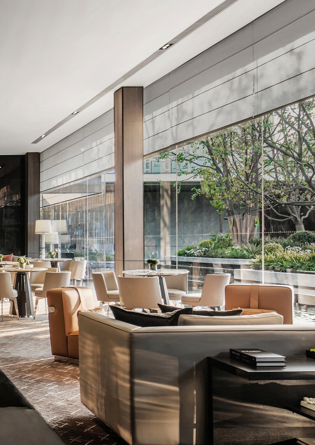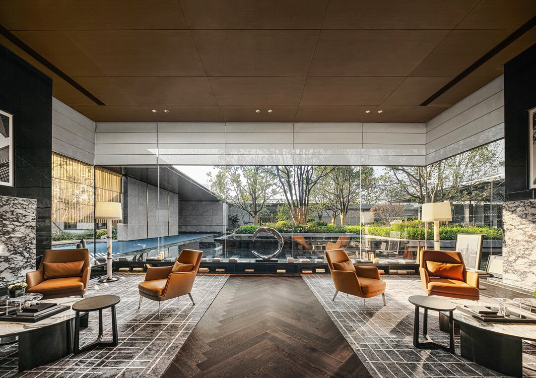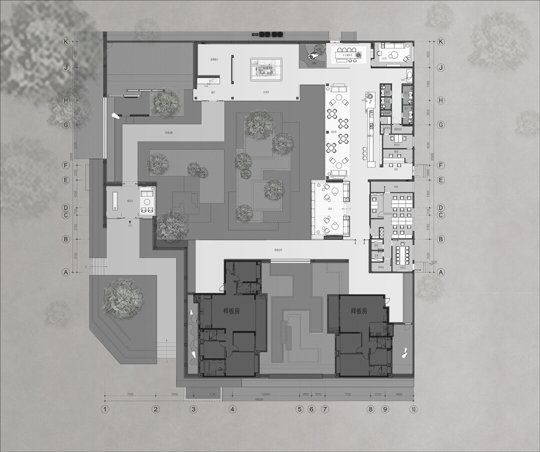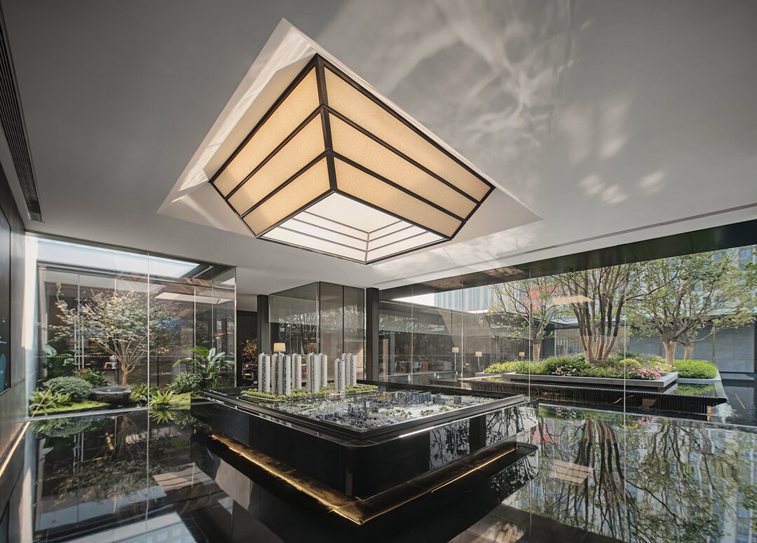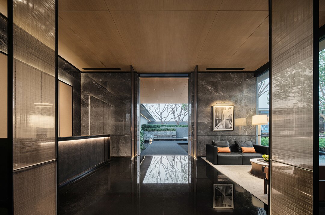 設(shè)計采用大采光的手法運(yùn)用借用室外造景手法,運(yùn)用玻璃幕墻裝飾,通過光與影的對接,將空間設(shè)計更貼近山水畫,讓客人在瀏覽的過程中放松心情,感受山水意境。