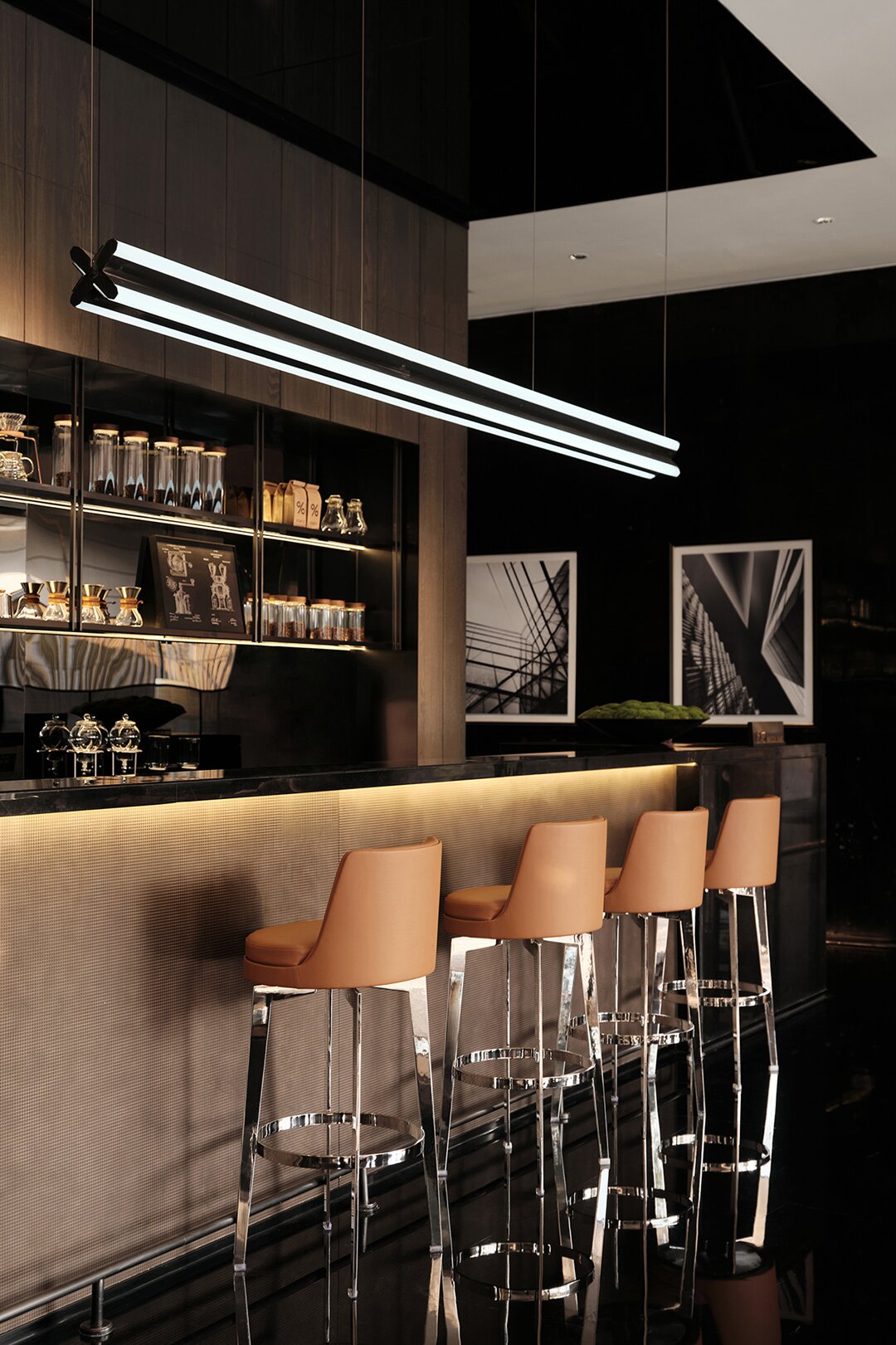 水吧區(qū)的酒柜通過金屬板制成一個個大小統(tǒng)一的方格,再配上二級燈管,將一處看似工整化的區(qū)域變成一處美麗風(fēng)景。