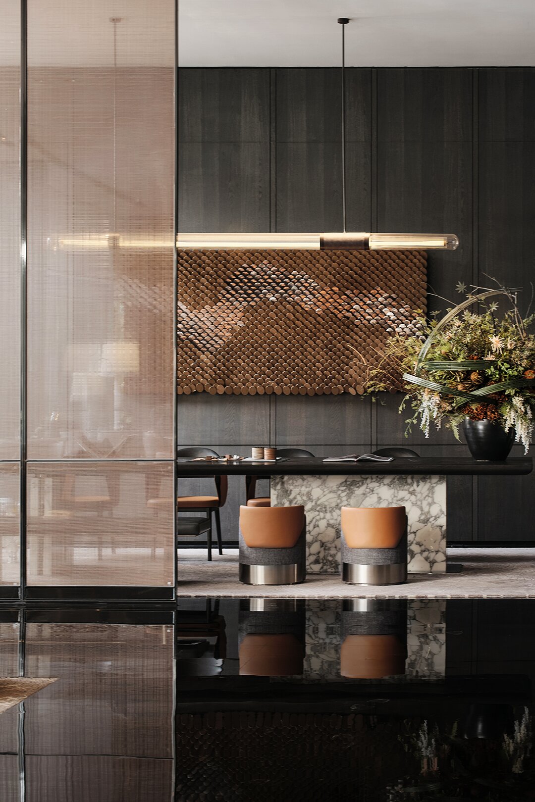 透過間隙觀看沙盤區(qū)或是洽談區(qū),將兩個空間形成相互窺視的視覺體驗。